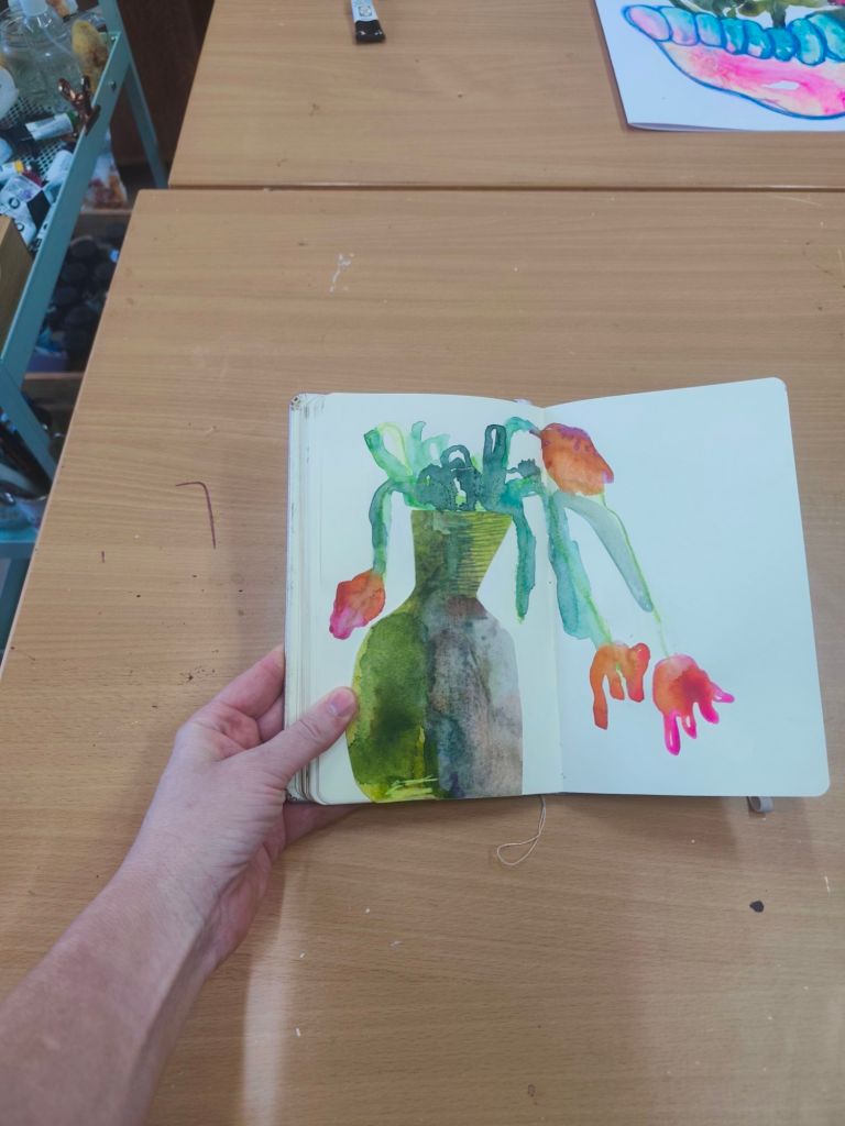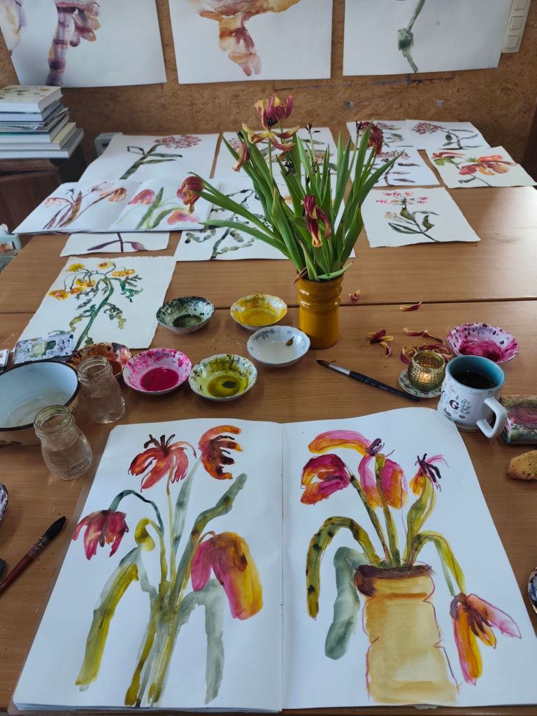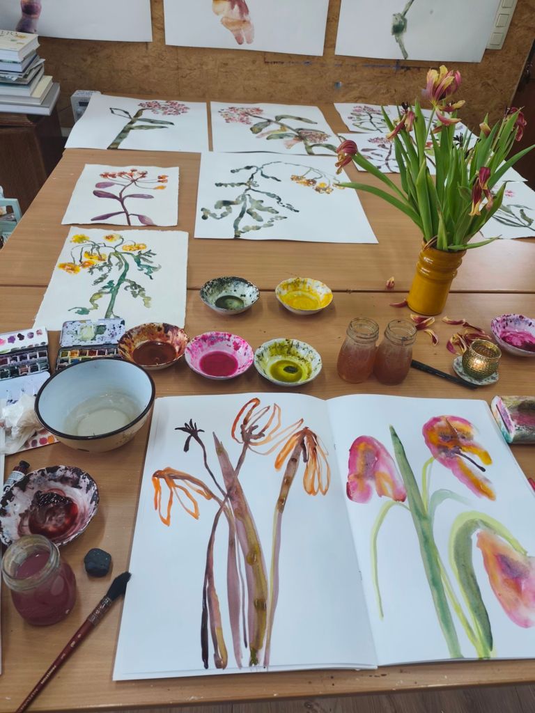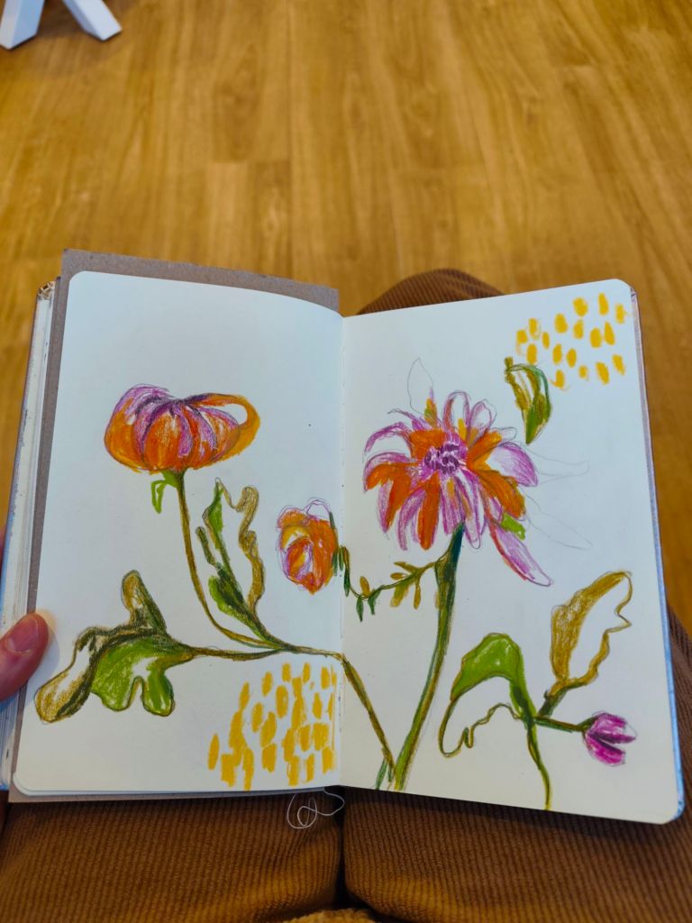Een schetsboek is voor mij ook een stap om in beweging te komen wanneer ik vastzit, het is een manier om ook op de lage energie dagen te kunnen creëren, het is een manier om in verbinding te blijven met mijn creativiteit. Het is een manier om de lat wat lager te leggen en vooral te ontspannen, te spelen, te genieten van het doen. Daarnaast gebruik ik het ook als een testfase, als voorstudies. Een test of een bepaalde compositie werkt, of een kleurenpalet me aanspreekt of….