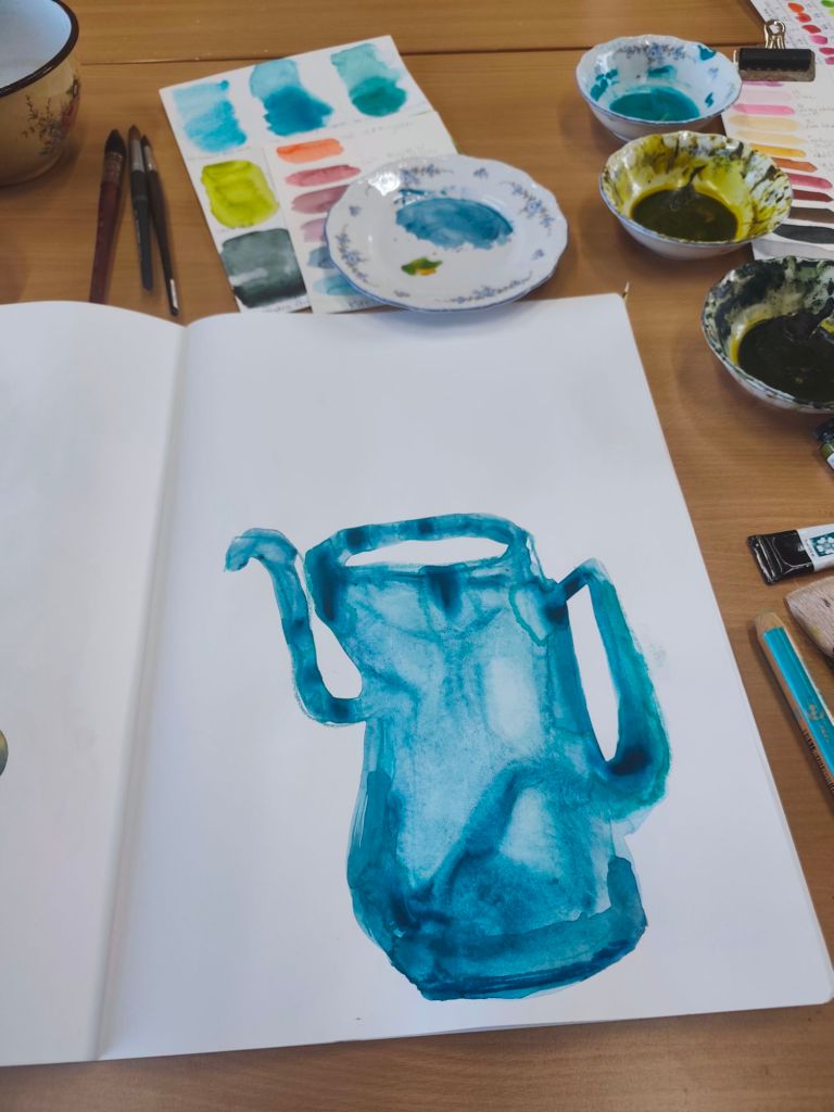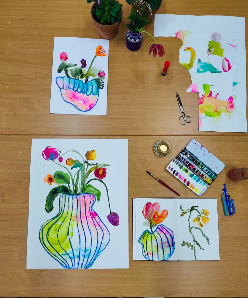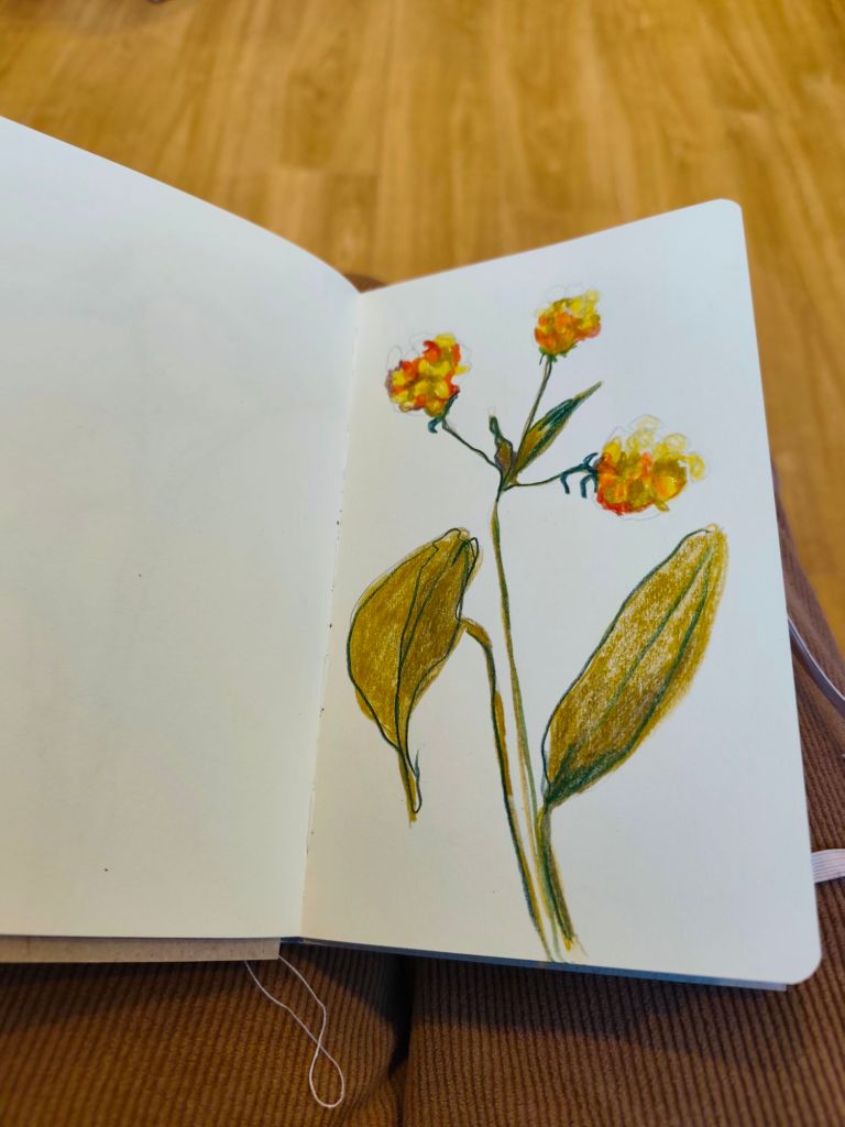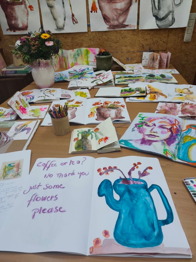 Een schetsboek is voor mij ook een stap om in beweging te komen wanneer ik vastzit, het is een manier om ook op de lage energie dagen te kunnen creëren, het is een manier om in verbinding te blijven met mijn creativiteit. Het is een manier om de lat wat lager te leggen en vooral te ontspannen, te spelen, te genieten van het doen. Daarnaast gebruik ik het ook als een testfase, als voorstudies. Een test of een bepaalde compositie werkt, of een kleurenpalet me aanspreekt of….